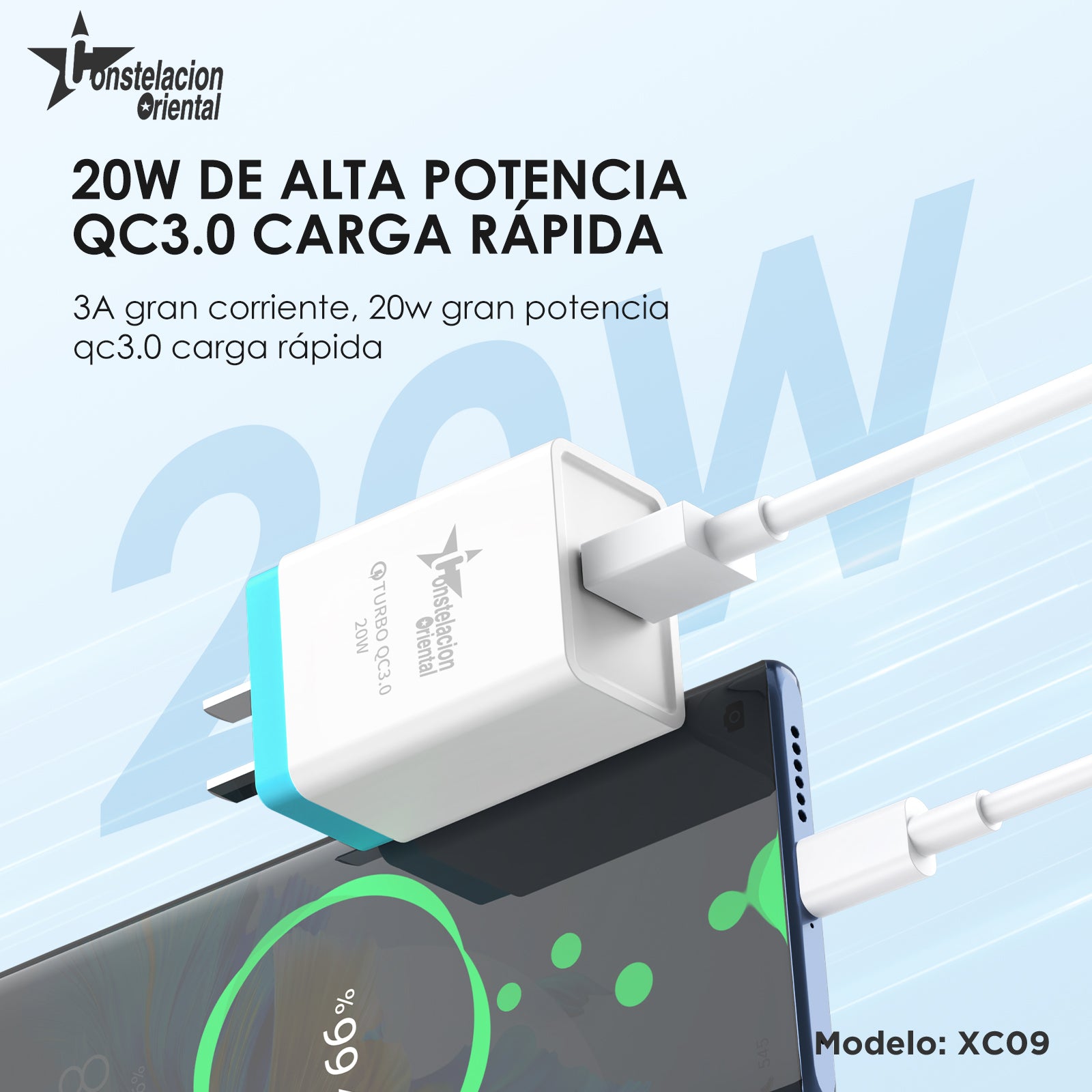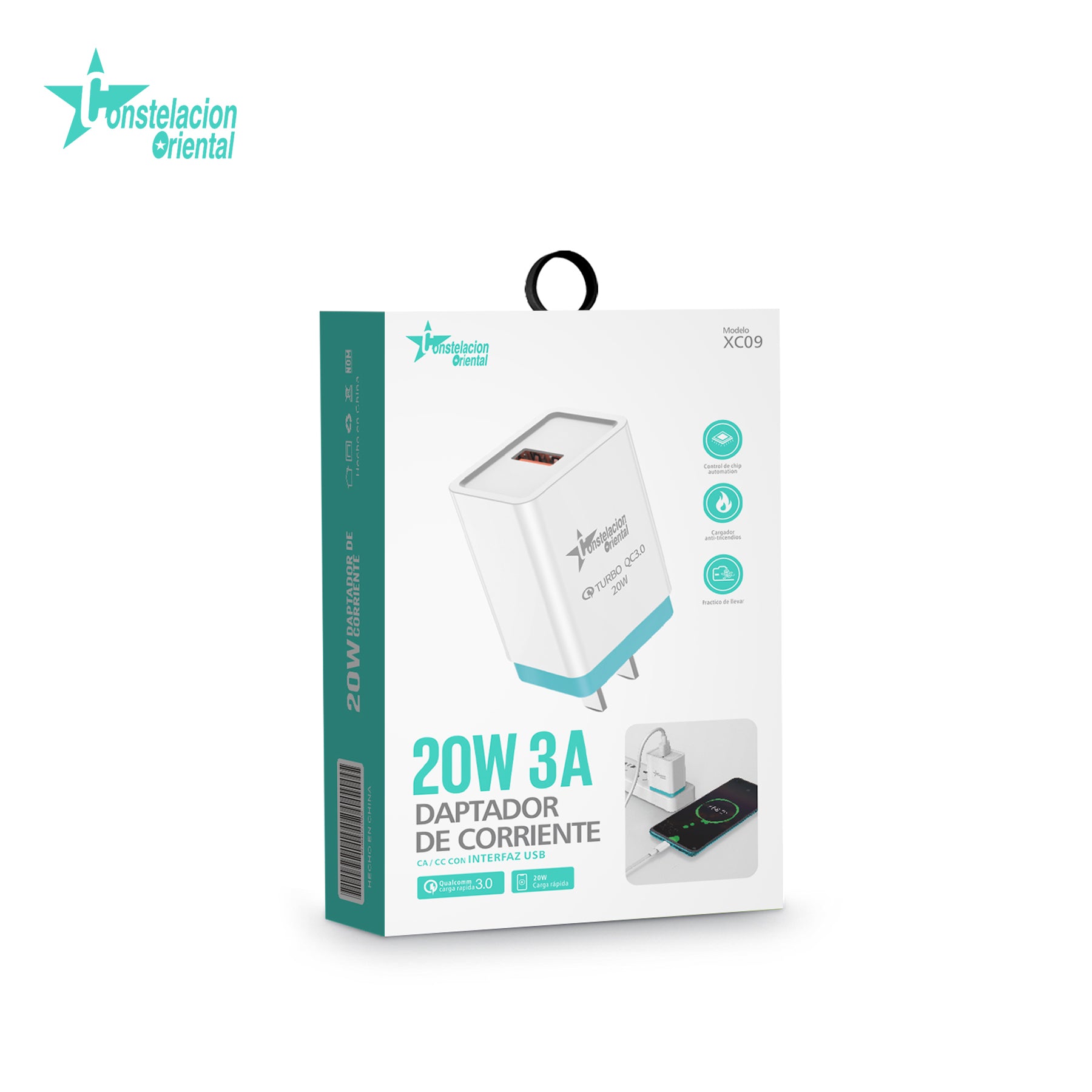 Turbo cargador con tecnología 3.0 de carga rápida, cuenta con un puerto USB de salida a 3A compatible con cualquier tipo de cable para cargar tus dispositivos, una carcasa recubierta con goma por dentro para mayor aislamiento y un sistema de protección contra sobre carga y cortos circuitos. .